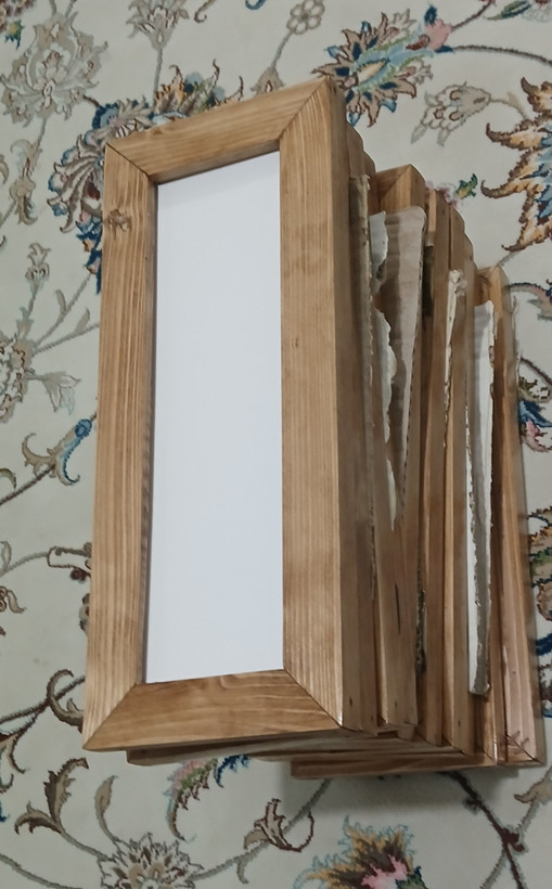قاب عکس چوبی جنس کار چوب روسی باروکش نیم پلی استربراق ابعاد ۱۰در۳۰ .به همراه شیشه وورق سه میل برای پشت کار.پشت کار پیچ است